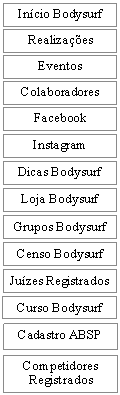 Ranking Bodysurf Master 1. Julio Cesar Rodrigues (BRASIL) - 1670 2. Leonardo Cavalcanti (BRASIL) - 1590 3. Rodrigo Soares (BRASIL) - 1555 4. Bruno Freitas (BRASIL) - 1280 5. Bruno Thadeus P. Da Silveira (Brunão) (BRASIL) - 1000 6. Fabio Gomes (BRASIL) - 860 7. Jorge Ribeiro de Paiva (BRASIL) - 730 8. Marcelo Marques de Almeida (BRASIL) - 610 8. Ewerton Marcelo Amaral Ribeiro (BRASIL) - 610 10. Claudio Xavier (BRASIL) - 610 11. Marcelo Cabral (BRASIL) - 555 11. Ricardo Amaro (BRASIL) - 555 11. Rodrigo Bruno (BRASIL) - 555 14. Juan Carlos Calmet Sotelo (Perú) - 500 14. Pierfranco Pastore (BRASIL) - 500 14. Angel Andrés Adrianzen Arrese (Perú) - 500 14. Romulo (BRASIL) - 500 14. Raul Monteiro de Azevedo (BRASIL) - 500 19. Ugo Genovez Aguiar (BRASIL) - 450