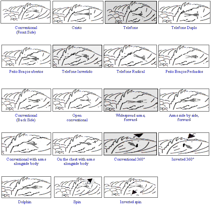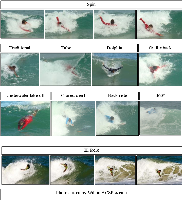 on the surface of the wave Remarks: All manouvers on the surface of the wave can be performed inverted or normally, inside or outside the barrow. Fluidity always counts on every manouver (the less foam, the better). This phase counts as 70% of the final assessment by judge. |