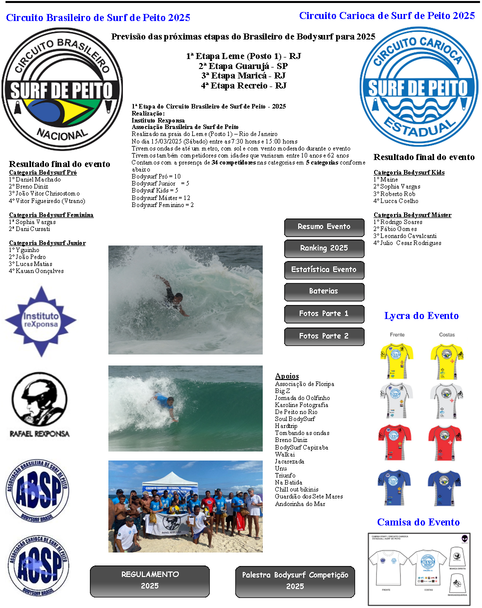 Realizado na praia de São Conrado (Posto 13 no sábado e canto direito no domingo) Estado: Rio de Janeiro Cidade: Rio de Janeiro Nos dias 08 e 09/11/2025 (Sábado e Domingo) entre as 8:00 horas e 17:00 horas No sábado tivemos perto de cancelar o evento devido à um ciclone, mas por volta das 8 horas o vento começou a ficar mais fraco, se transformando em um terral forte. O mar ficou com ondas altas e fortes. Tivemos ondas de até 2,5 metros, com chuva, sol as vezes. O vento no domingo ficou sudoeste constante, decidimos que a competição seria no canto direito de São Conrado, mais protegido do vento e da correnteza forte. Tivemos também competidores com idades que variaram entre 17 anos e 62 anos